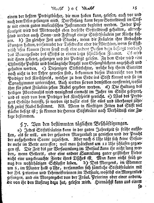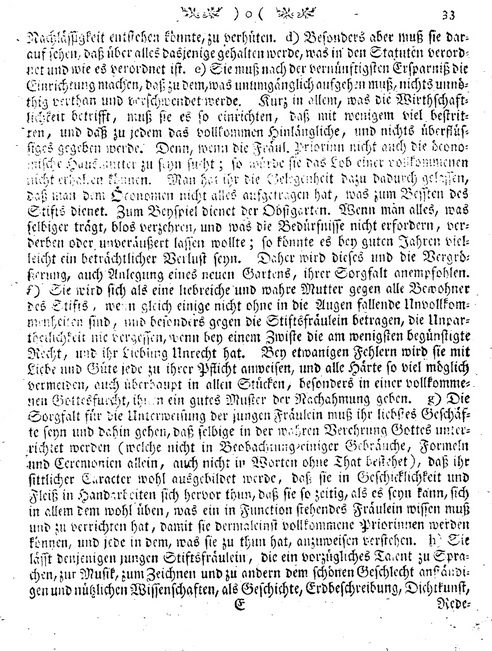 Da, zur Erhaltung des Stifts, fuer gute Oeconomie, fuer die Aufrechterhaltung seiner Gerechtsame und seiner innern guten Ordnung gesorgt werden muss; so ist von dem Oeconomen, den Herren Stiftsvaetern oder Curatoren, der Fraeulein Priorinn, den Stiftsfraeulein, den Lehrmeisterinnen u.s.w. in folgender Ordnung zu handeln:
