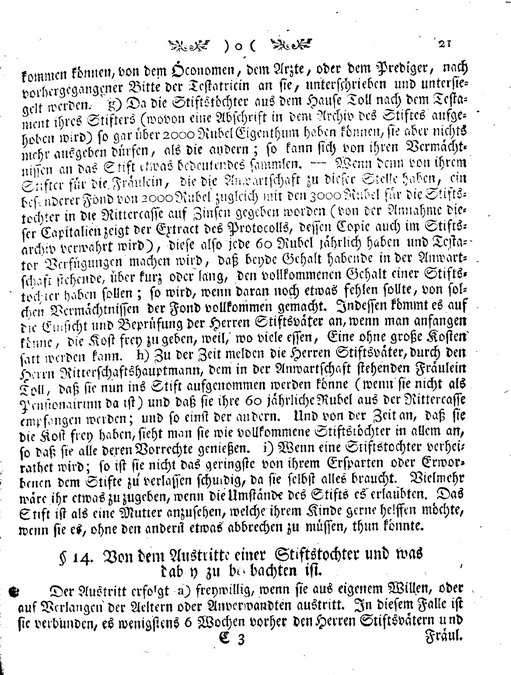b) In Ansehung ihres Vermoegens muss sie dieser Anstalt beduerftig seyn, das heisst, weniger als Tausend Rubel eigenes Vermoegen haben. Sollte Einer ein Vermoegen von etwa Tausend Rubeln in der Zeit zufallen, da sie schon Stiftstochter ist; so muss sie die halben Zinsen davon jaehrlich dem Stifte geben, wenn sie Stiftstochter bleiben will. Faellt aber Einer ein Vermoegen zu, dass sie drey Tausend Rubel reich wird; so macht sie einer Armen Platz, und kann nicht mehr Stiftstochter seyn. Will sie als Pensionairinn im Stifte bleiben und fuer ihren Unterhalt, Kleidung und Bedienung jaehrlich Hundert und Achtzig Rubel bezahlen; so behaelt sie alle Vorrechte einer Stiftstochter, zu allen Wahlen und dergl. gezogen zu wer-