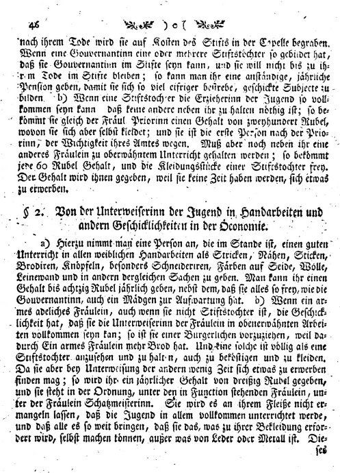 a) Hierzu nimmt man eine Person an, die im Stande ist, einen guten Unterricht in allen weiblichen Handarbeiten als Stricken, Naehen, Sticken, Brodiren, Knoepfeln, besonders Schneideriren, Faerben auf Seide, Wolle, Leinwand und in andern dergleichen Sachen zu geben. Man kann ihr einen Gehalt bis achtzig Rubel jaehrlich geben, nebst dem, dass sie alles so frey, wie die Gouvernantinn, auch ein Maedgen zur Aufwartung hat.