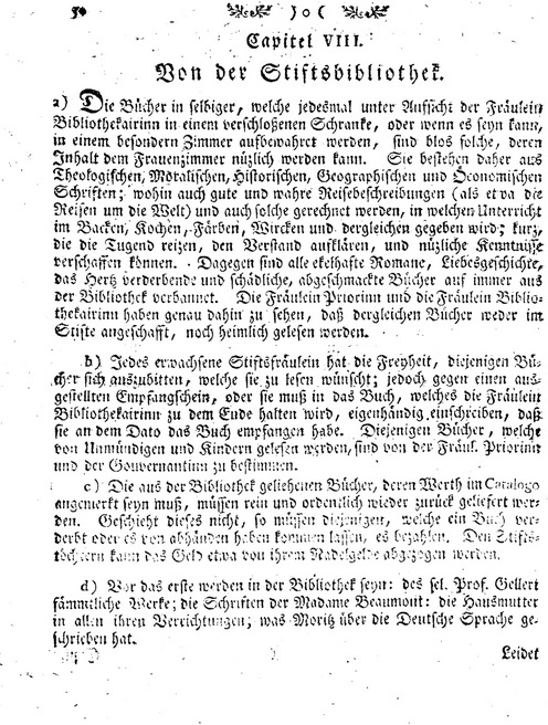 a) Die Buecher in selbiger, welche jedesmal unter Aufsicht der Fraeulein Bibliothekairinn in einem verschlossenen Schranke, oder wenn es seyn kann, in einem besonderen Zimmer aufbewahret werden, sind blos solche, deren Inhalt dem Frauenzimmer nuetzlich werden kann. Sie bestehen daher aus Theologischen, Moralischen, Historischen, Geographischen und Oeconomischen Schriften; wohin auch gute und wahre Reisebeschreibungen (als etwa die Reisen um die Welt) und auch solche gerechnet werden, in welchen Unterricht im Backen, Kochen, Faerben, Wircken und dergleichen gegeben wird; kurz, die die Tugend reizen, den Verstand aufklaeren, und nuetzliche Kenntnisse verschaffen koennen. Dagegen sind alle ekelhafte Romane, Liebesgeschichte, das Herz verderbende und schaedliche, abgeschmackte Buecher auf immer aus der Bibliothek verbannt. Die Fraeulein Priorinn und die Fraeulein Bibliothekairinn haben genau dahin zu sehen, dass dergleichen Buecher weder im Stifte angeschafft, noch heimlich gelesen werden.