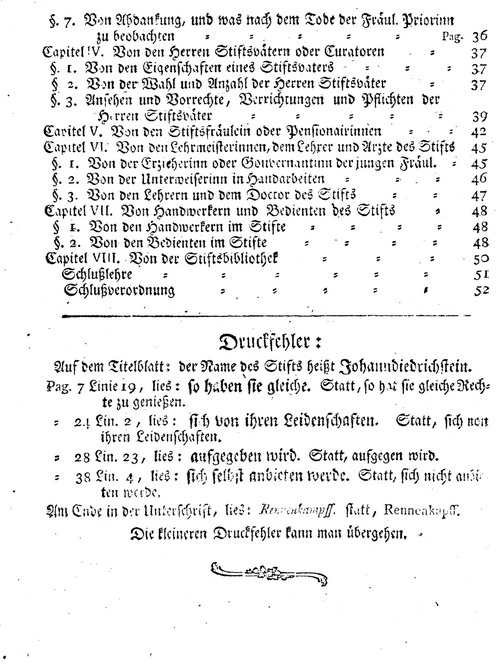 Da, zur Erhaltung des Stifts, fuer gute Oeconomie, fuer die Aufrechterhaltung seiner Gerechtsame und seiner innern guten Ordnung gesorgt werden muss; so ist von dem Oeconomen, den Herren Stiftsvaetern oder Curatoren, der Fraeulein Priorinn, den Stiftsfraeulein, den Lehrmeisterinnen u.s.w. in folgender Ordnung zu handeln.